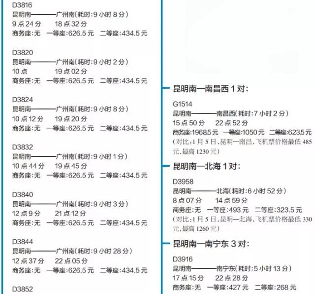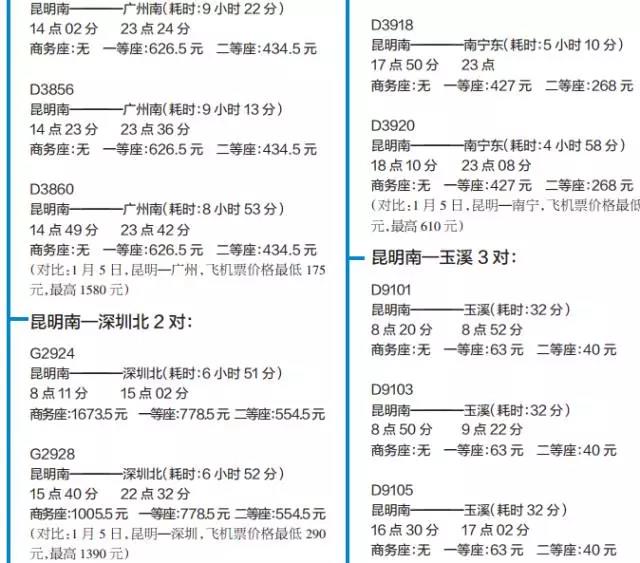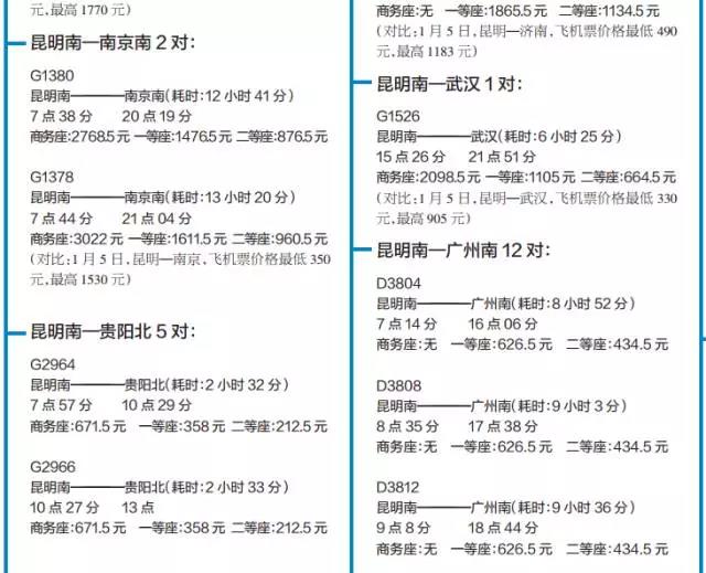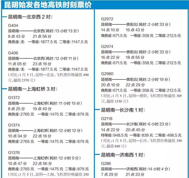 (以上车次为1月5日调图后从昆明首发车次,机票价格为携程网即时报价)